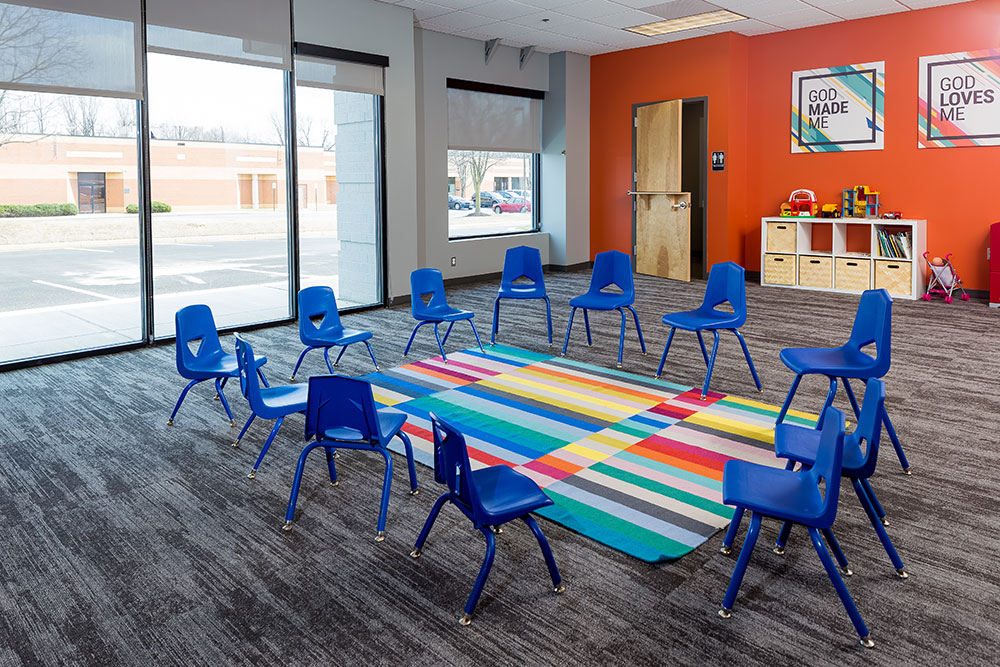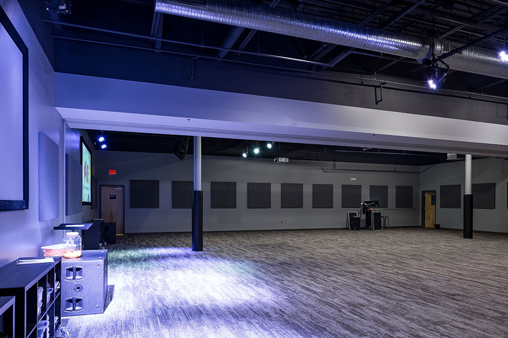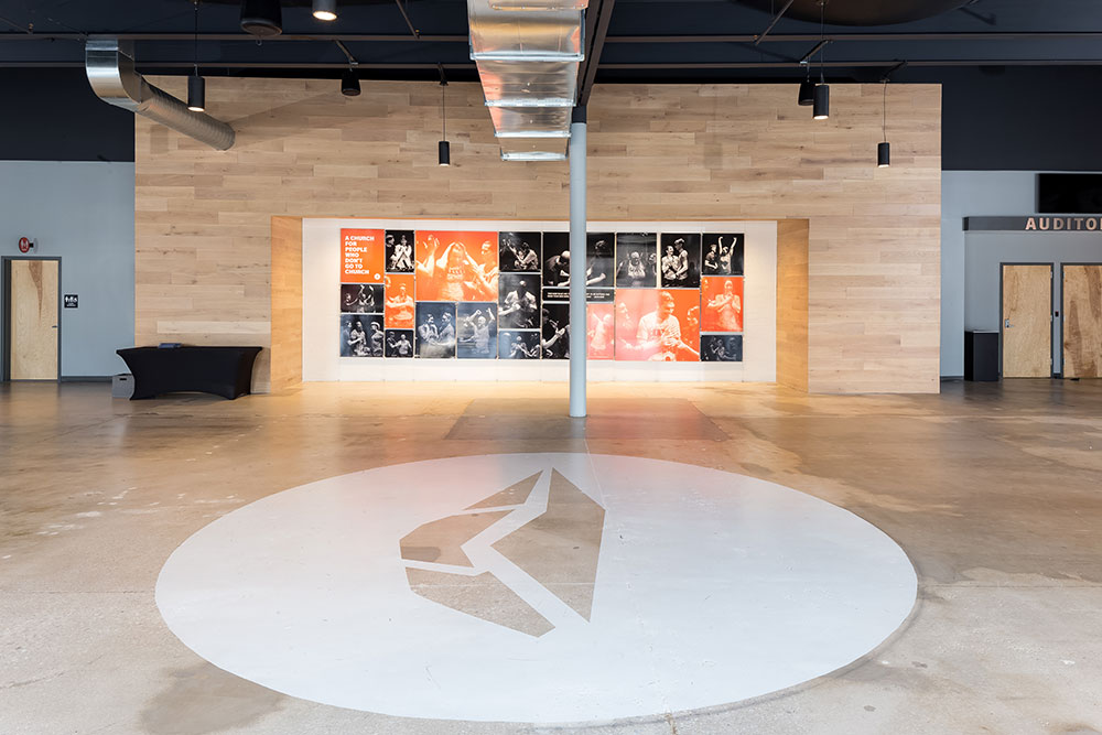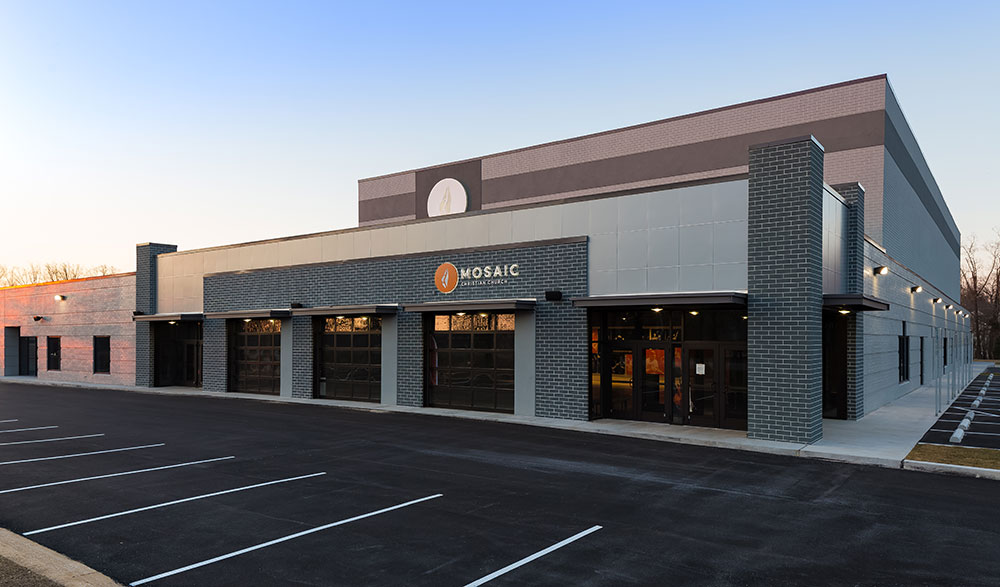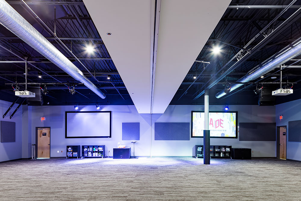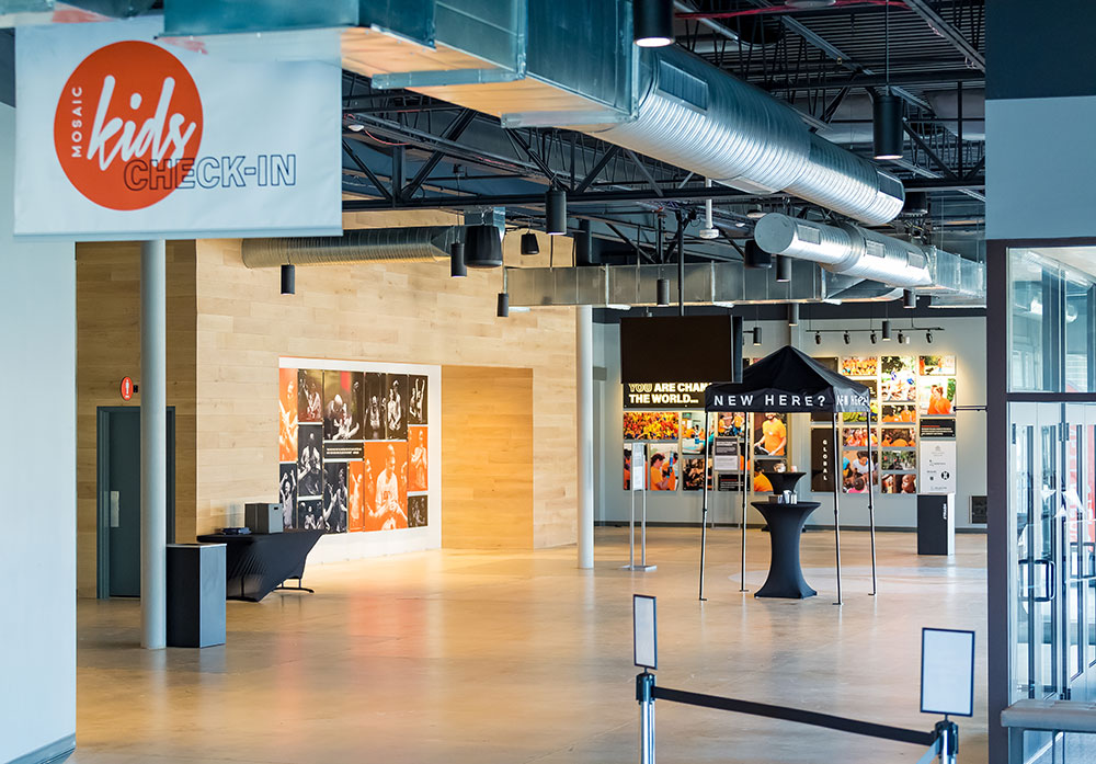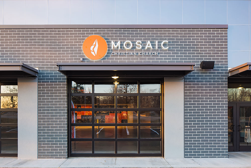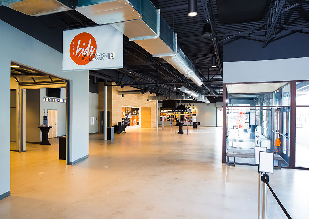 Mosaic strives for a great in-person experience with authenticity. With a clean, simple aesthetic, the building intentionally doesn’t look like a church. Mosaic converted a single-story office building into an energic facility which seats 800 for worship and includes kids classrooms and offices. The auditorium area was demolished and rebuilt to provide 27’ tall, open rooms. Garage doors open the foyer to the front parking lot on good weather days. The office plan is open for collaborative work and access to views. Behind the scenes are spaces for video production, communion preparation, and baptism changing rooms.
