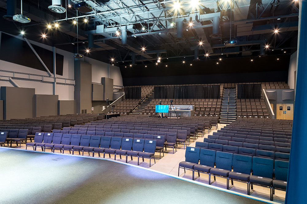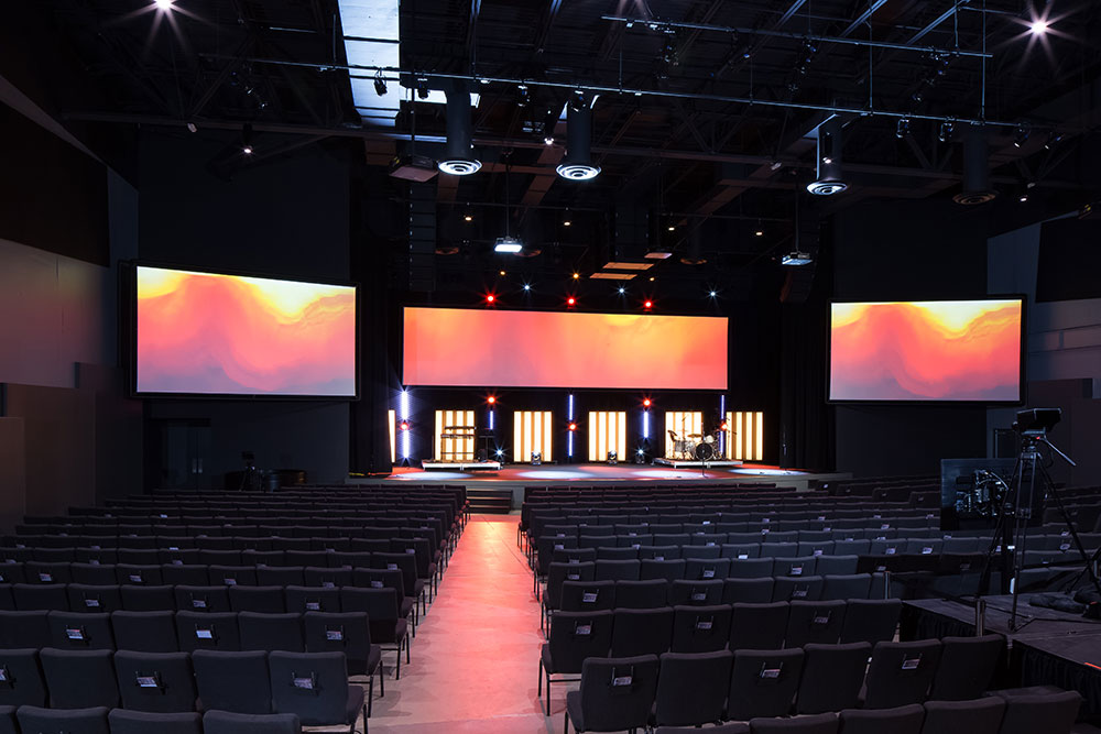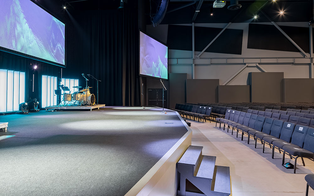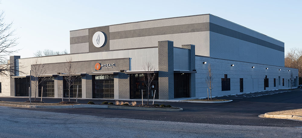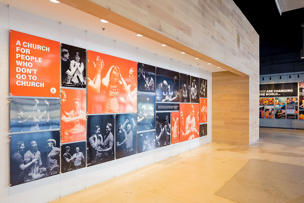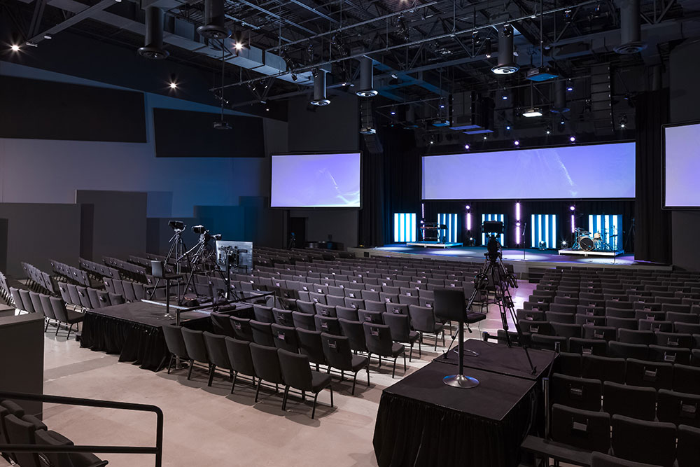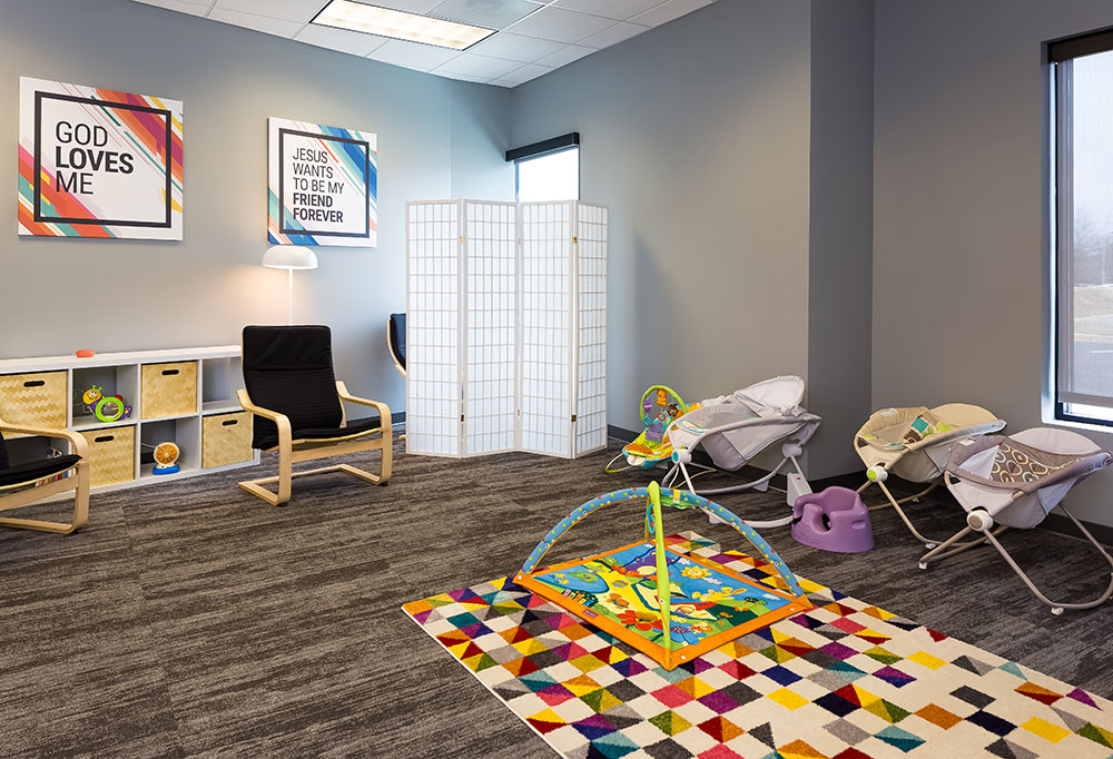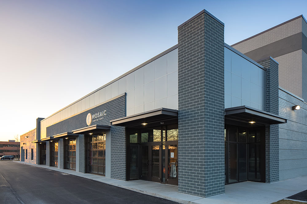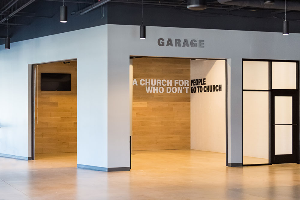 Mosaic strives for a great in-person experience with authenticity. With a clean, simple aesthetic, the building intentionally doesn’t look like a church. Mosaic converted a single-story office building into an energic facility which seats 800 for worship and includes kids classrooms and offices. The auditorium area was demolished and rebuilt to provide 27’ tall, open rooms. Garage doors open the foyer to the front parking lot on good weather days. The office plan is open for collaborative work and access to views. Behind the scenes are spaces for video production, communion preparation, and baptism changing rooms.