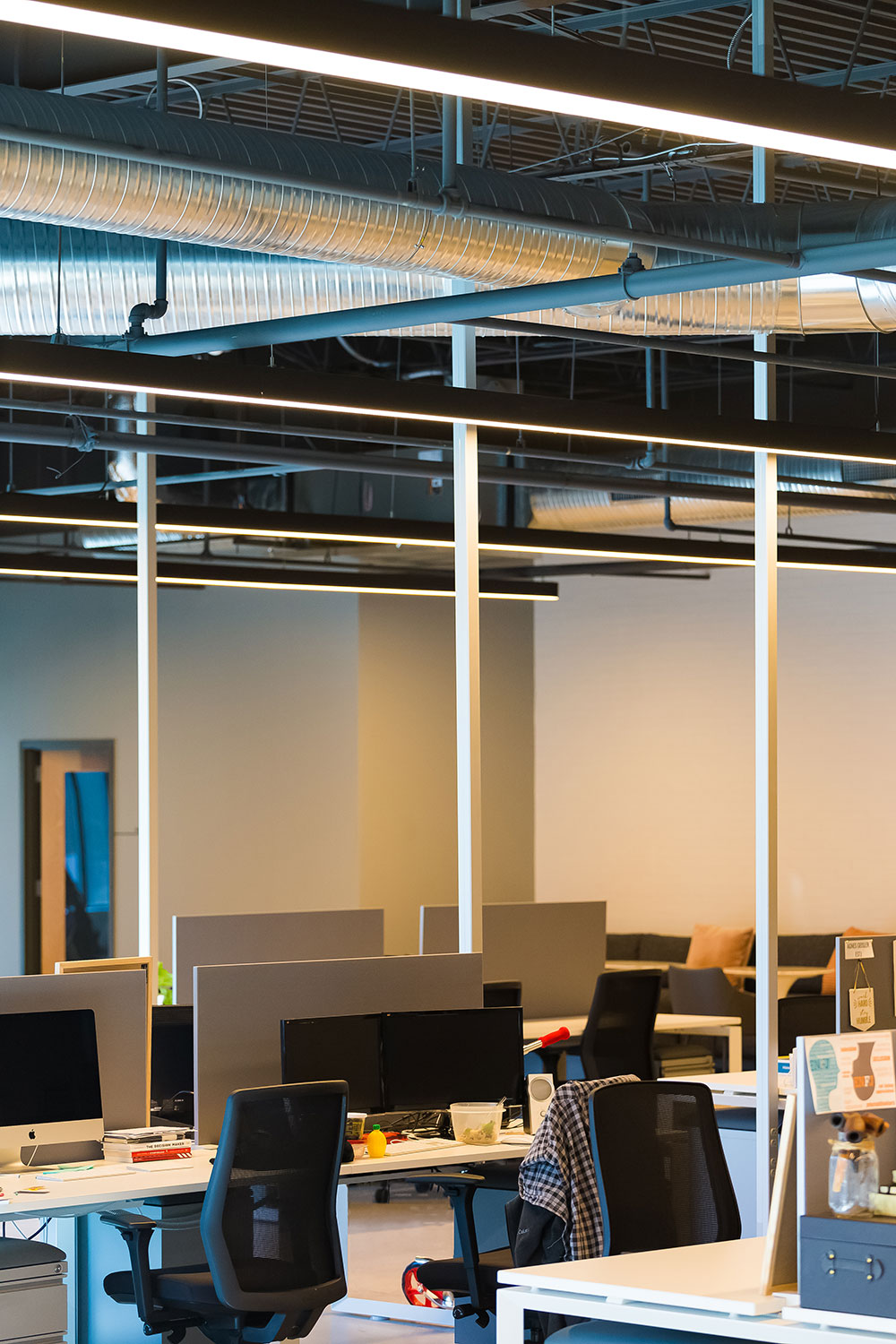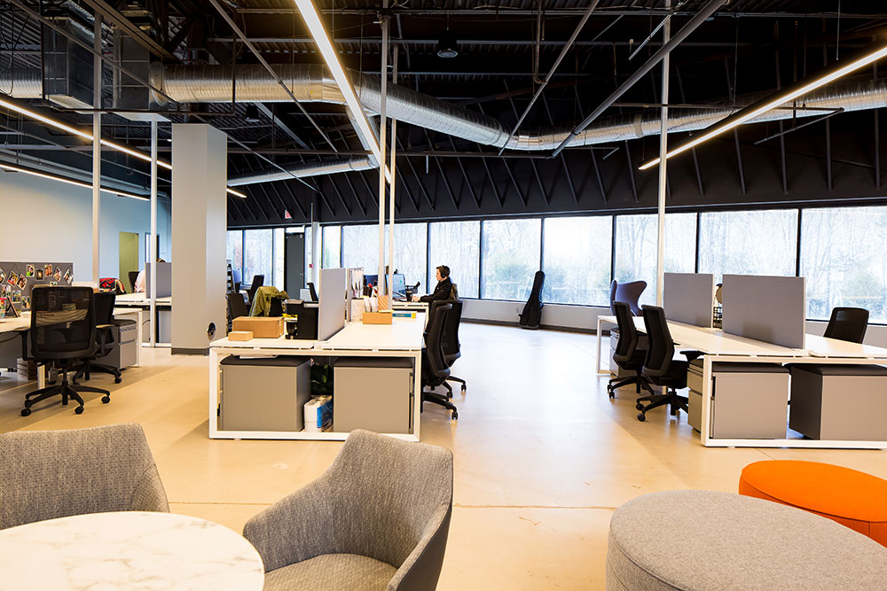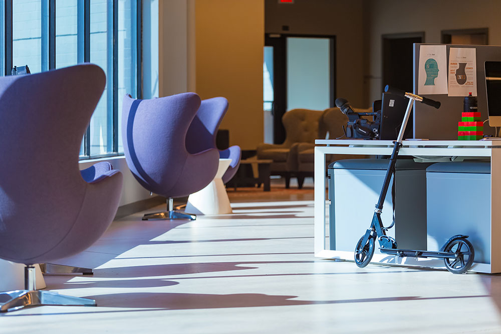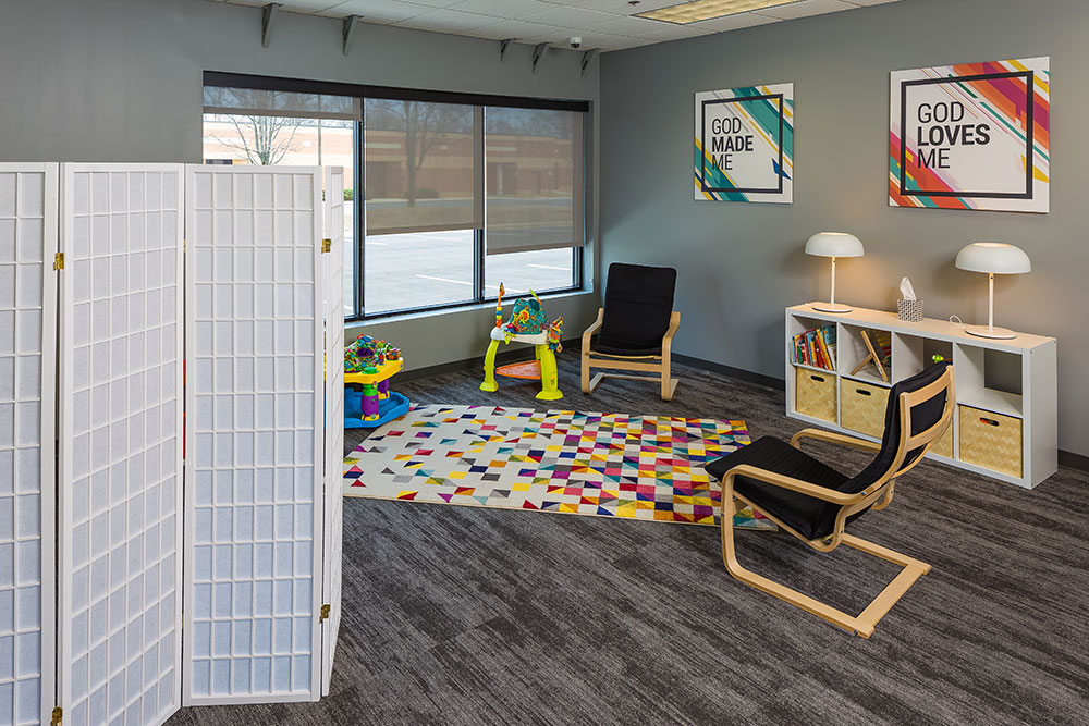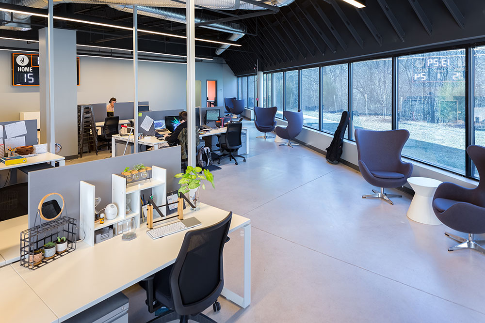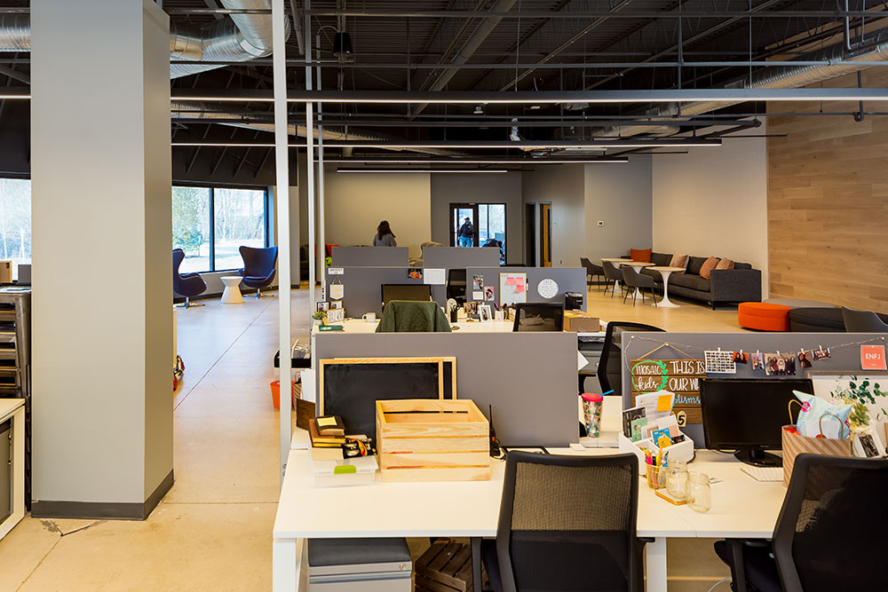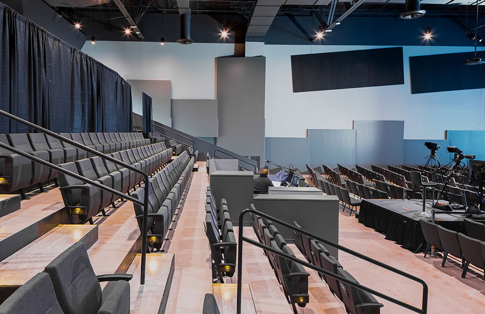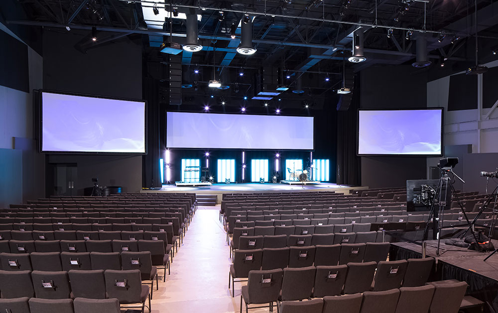Mosaic strives for a great in-person experience with authenticity. With a clean, simple aesthetic, the building intentionally doesn’t look like a church. Mosaic converted a single-story office building into an energic facility which seats 800 for worship and includes kids classrooms and offices. The auditorium area was demolished and rebuilt to provide 27’ tall, open rooms. Garage doors open the foyer to the front parking lot on good weather days. The office plan is open for collaborative work and access to views. Behind the scenes are spaces for video production, communion preparation, and baptism changing rooms.