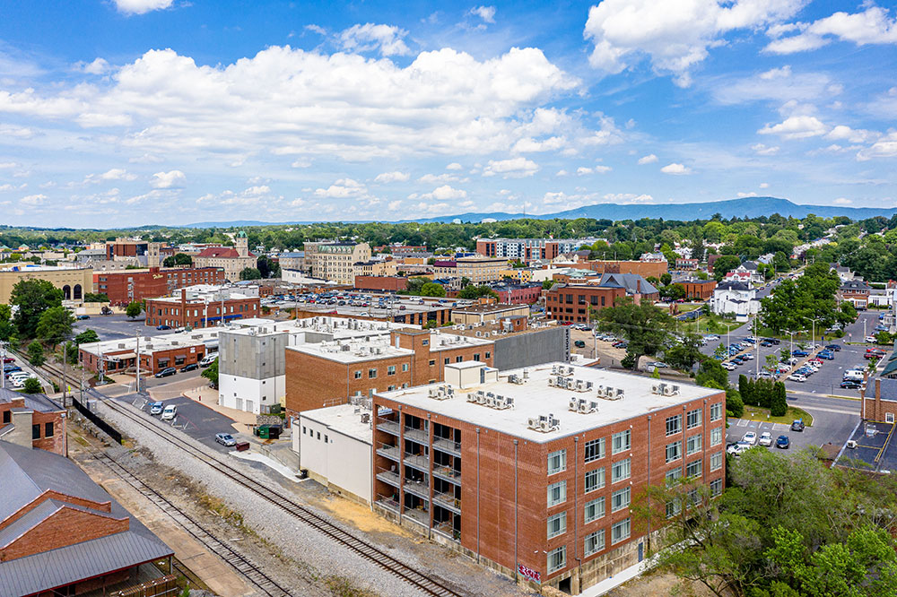 LDDBlueline™ designed a four floor building with 35 apartments ranging in size from 1,400 square foot two-bedroom units to 600 square foot single bedroom apartments. Units along the west side have balconies and all the units have ample windows providing compelling views of Harrisonburg and beyond. Space under the building is utilized for tenant storage. Amenities include a gym.