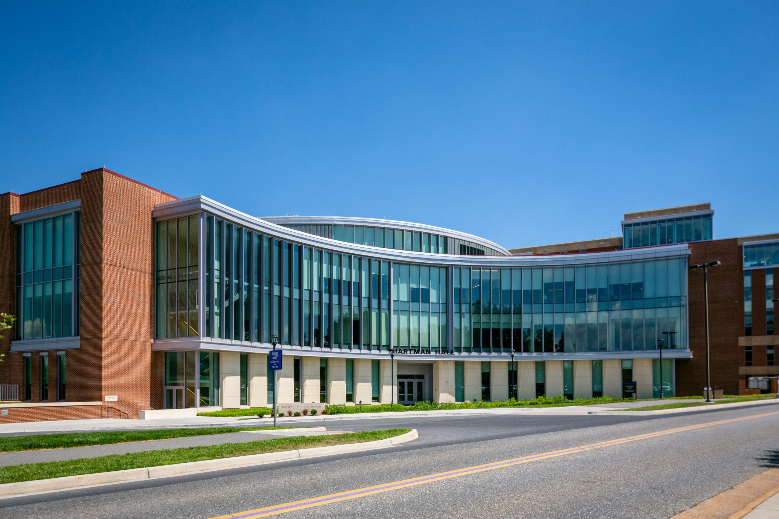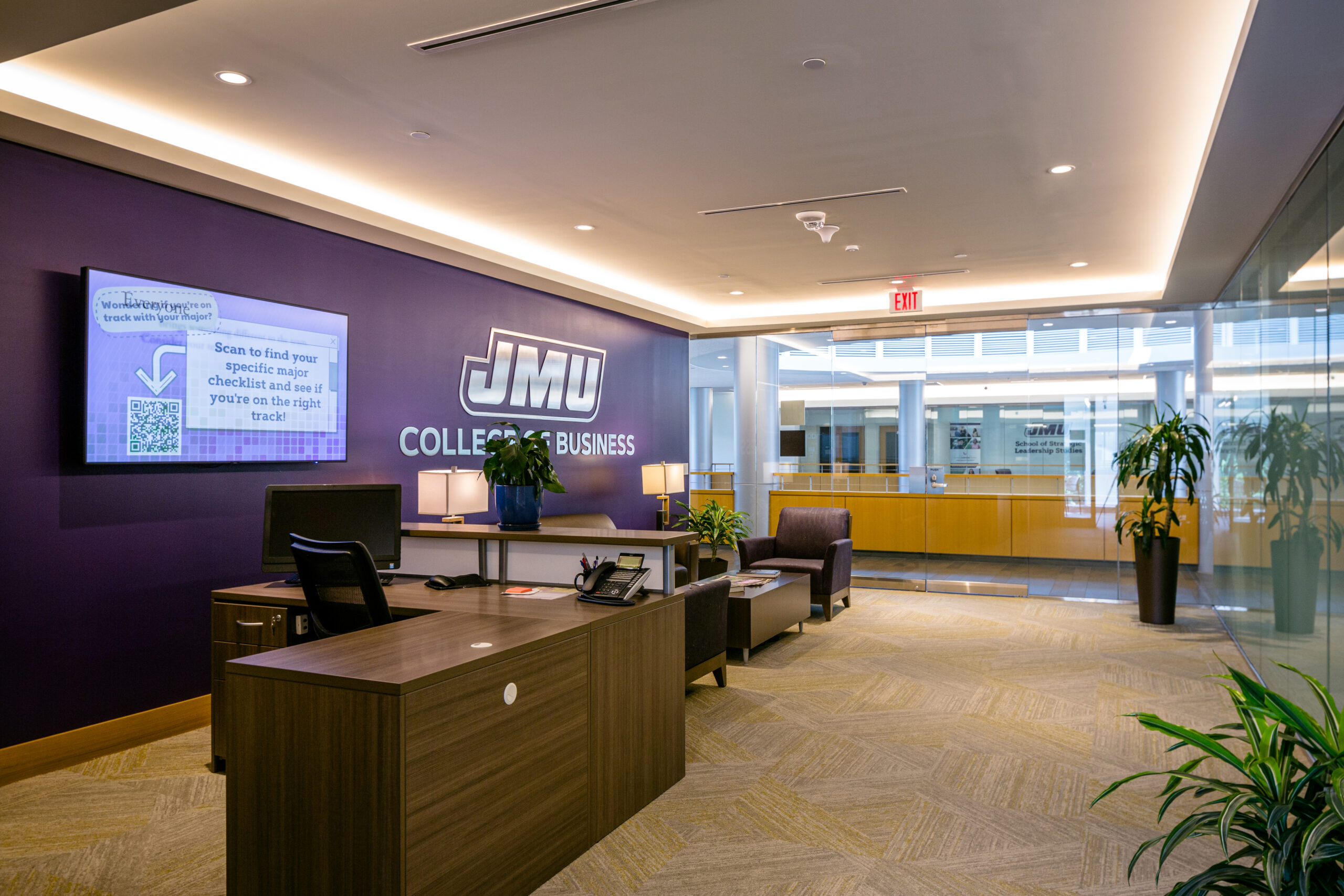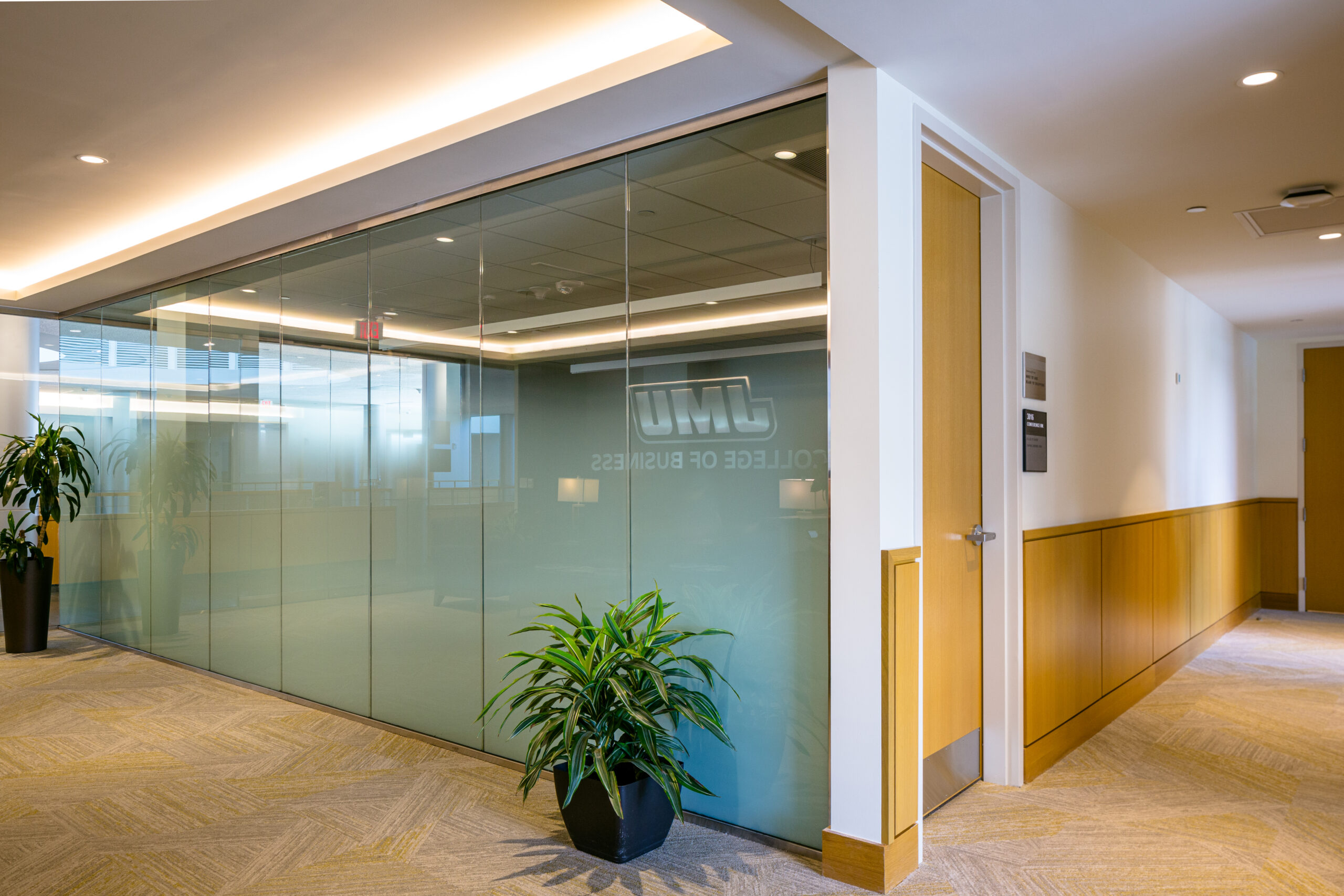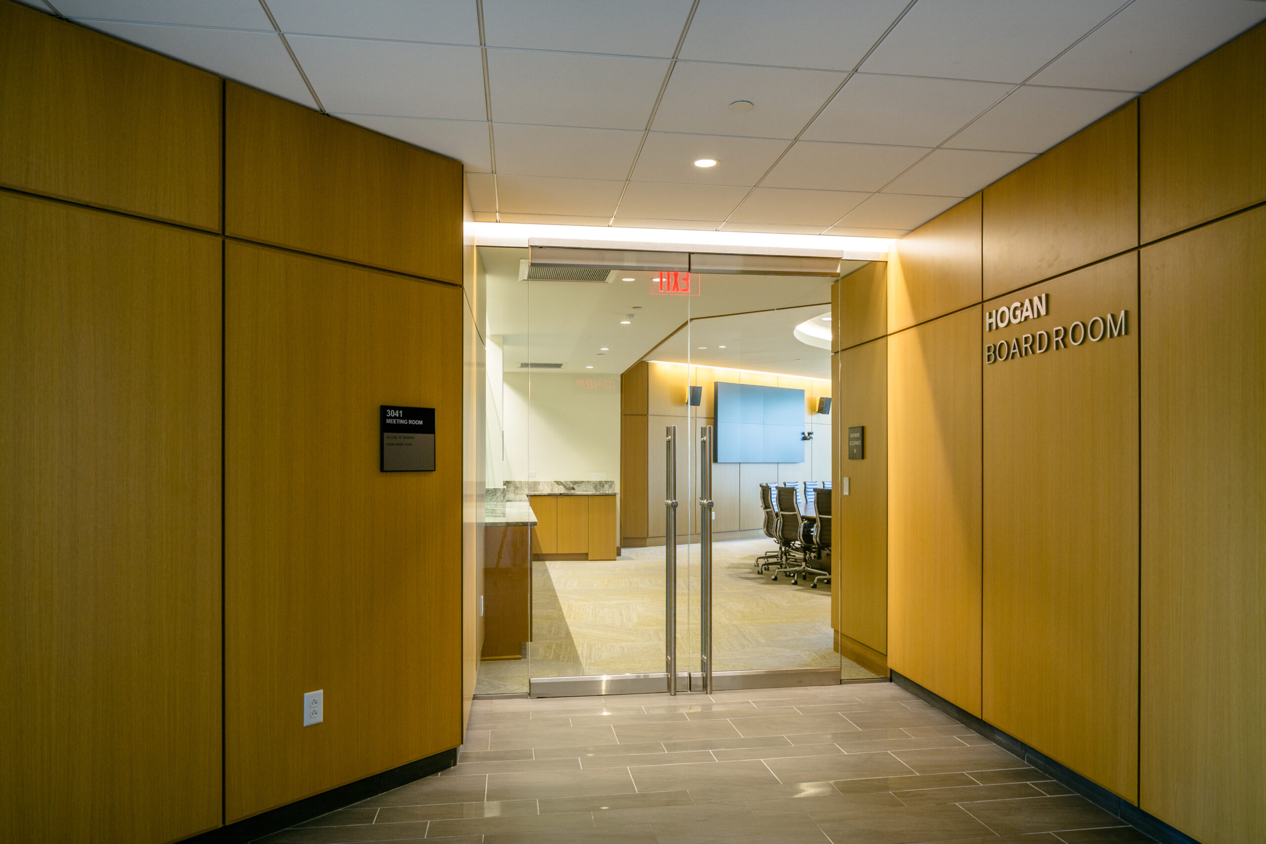 Hartman Hall, home to the College of Business, sits with outstretched arms at the southwest entrance to James Madison University’s campus in Harrisonburg, VA. Faculty, staff, and visitors to the building are greeted by the breathtaking, three-story, oval-shaped atrium as they enter. Ascending the atrium’s wood paneled staircase to the 3rd floor, visitors discover the Hogan Boardroom which serves as both a meeting space and event venue for prestigious gatherings throughout the year. Despite the room’s high status, the plain walls and uninviting wood entry doors failed to match the luster of the surrounding building.