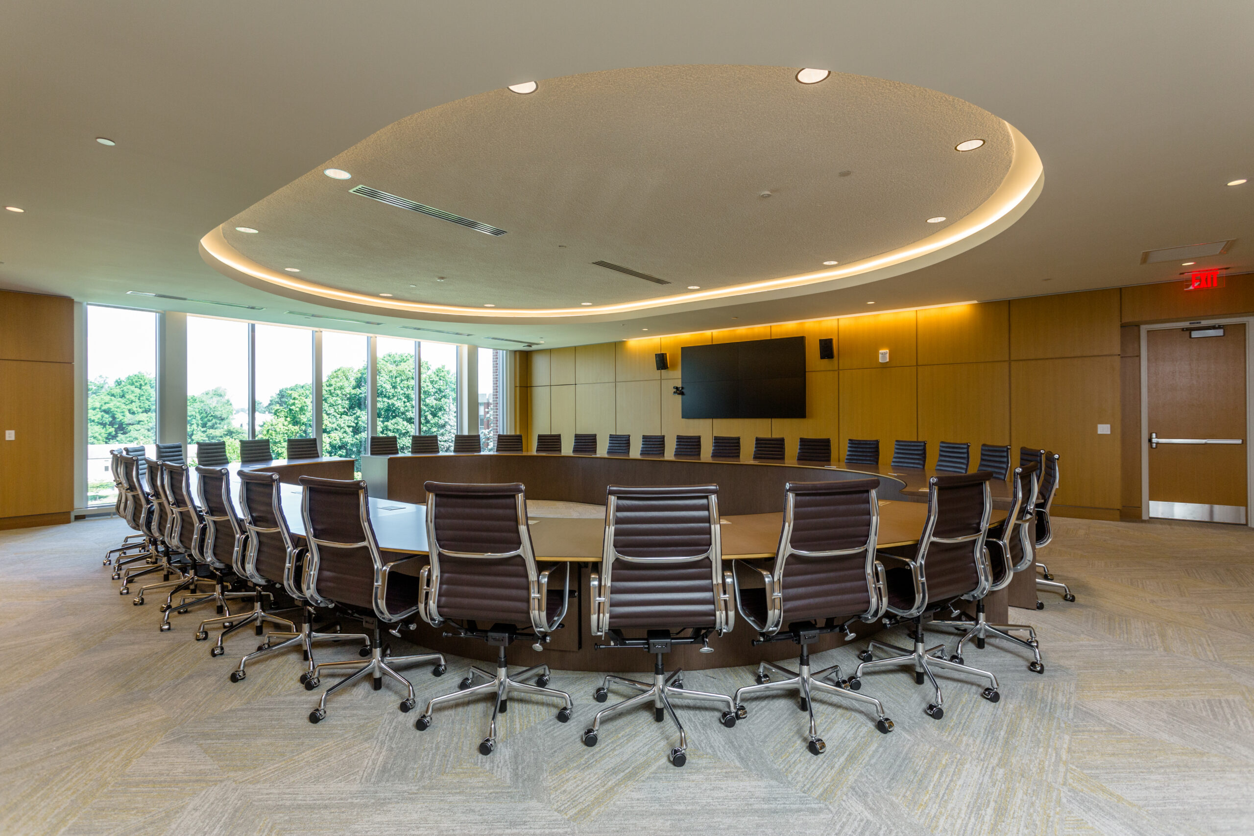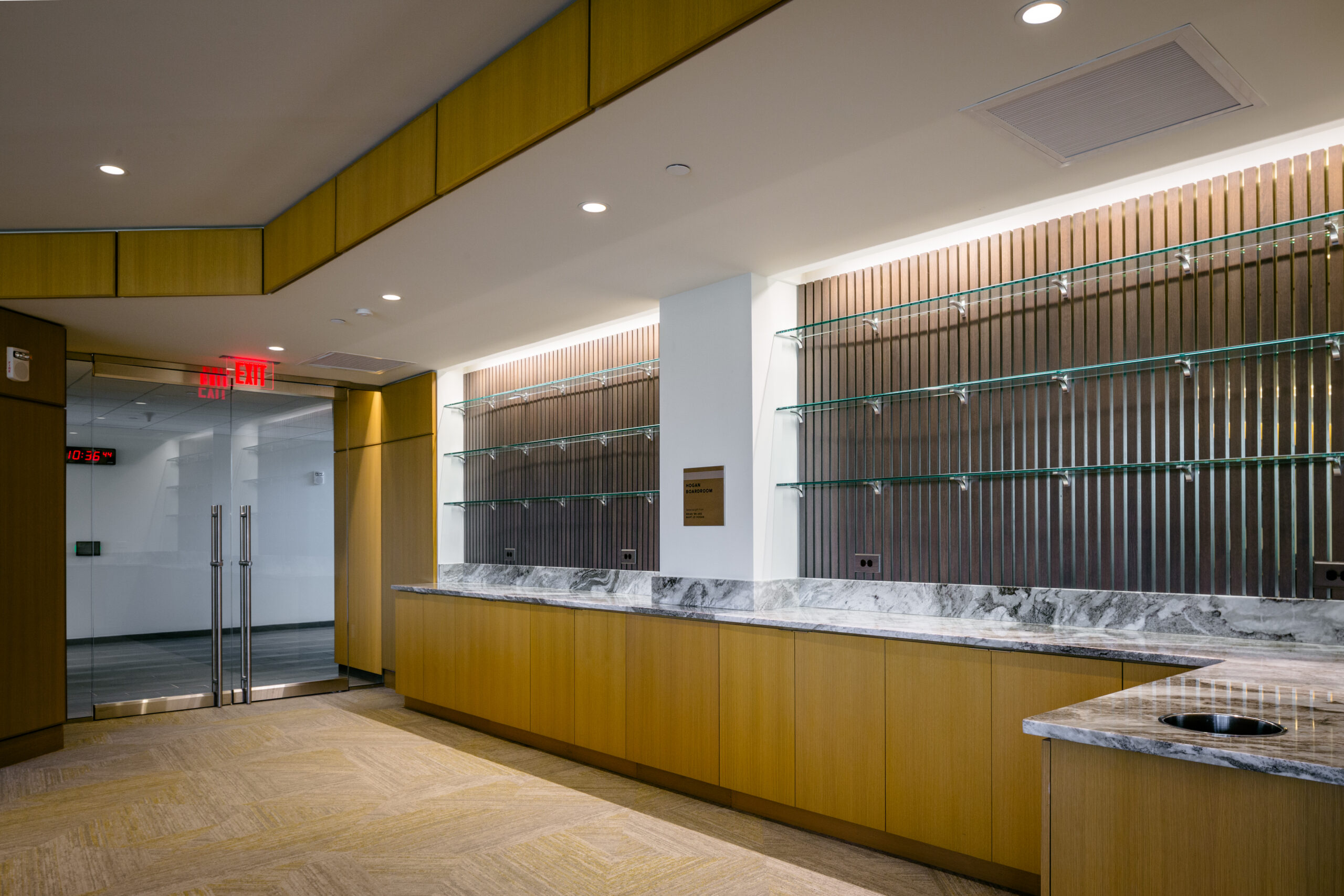 LDDBlueline™ was brought in to assess the Boardroom’s uses and to provide functional solutions that would elevate the room’s aesthetic and create a suitable space for such distinguished events. We embraced this task by providing meticulously detailed drawings that ensured the new wood paneling on the walls perfectly matched the wood paneling in the atrium, we created a hidden set of doors to keep the coat closet out of sight when not in use, and we revamped the Boardroom’s entry with a new set of glass doors which better emphasized the college’s focus on transparency. Lastly, we designed a display of glass shelves hanging in front of wooden slats that matched the existing boardroom table with gold mirror positioned to capture and spread the light from the large windows on the far side of the room.