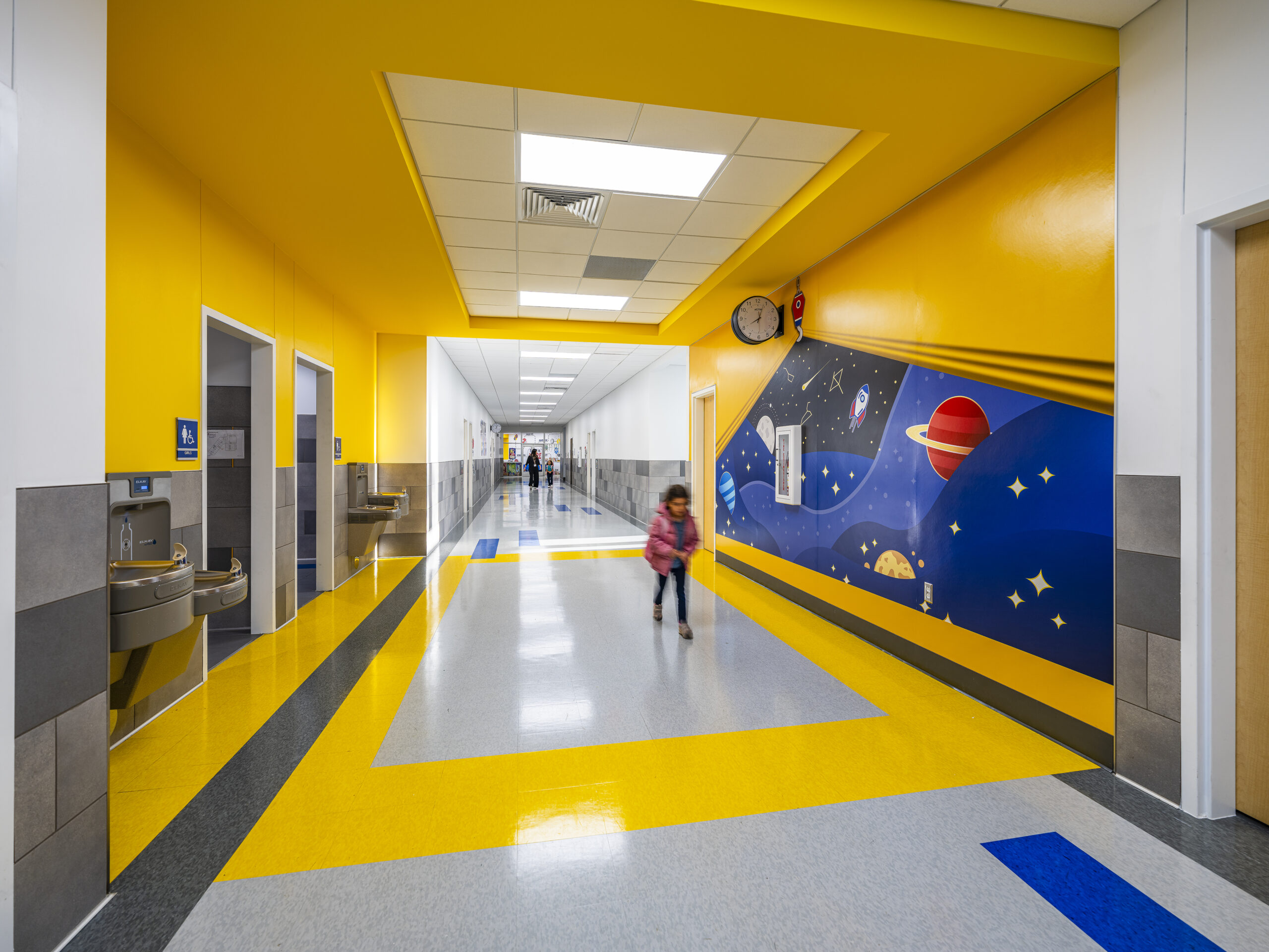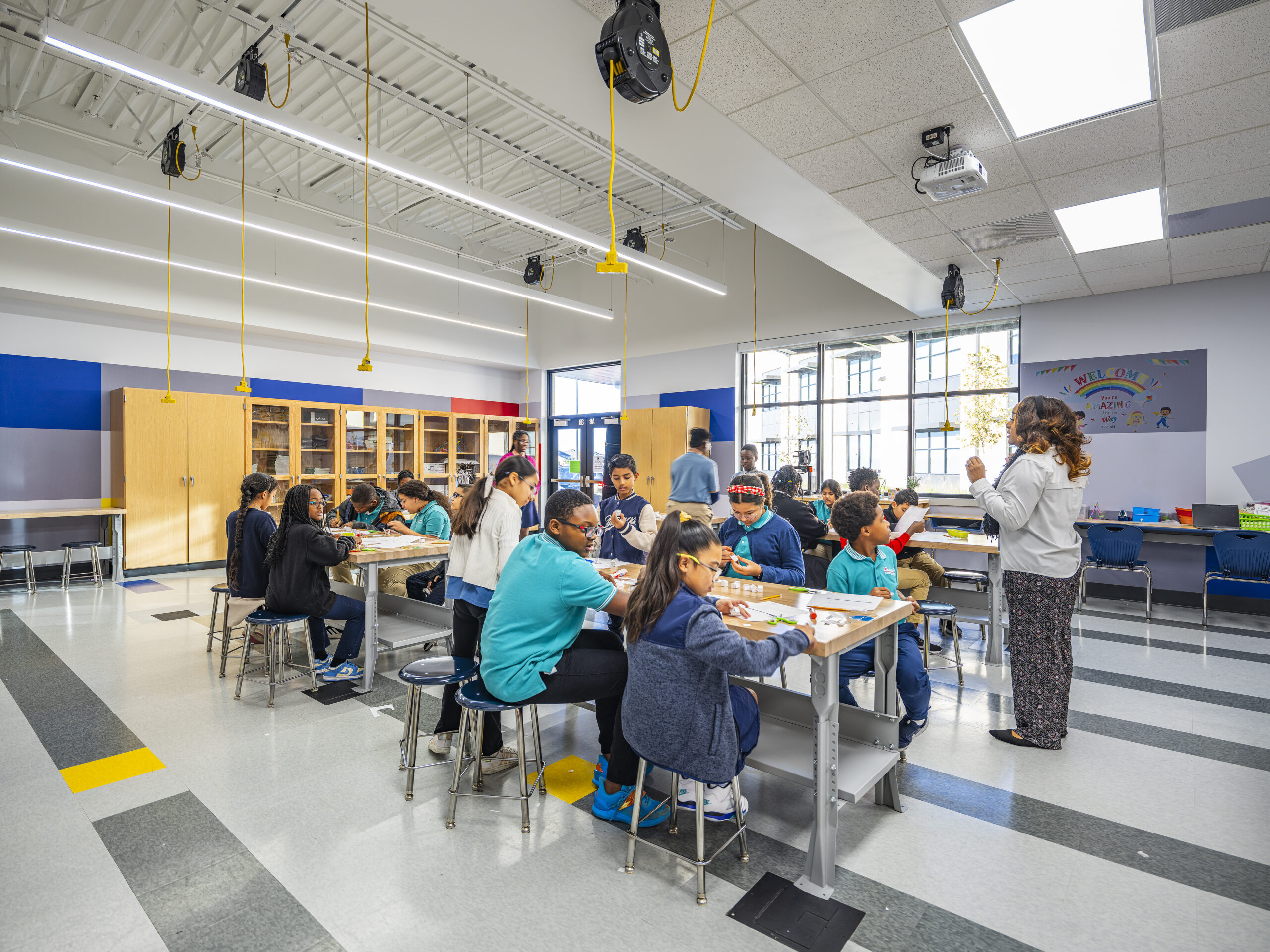 projects. Color, lighting, and environmental graphics enhance wayfinding and reinforce the school’s identity. Natural daylighting and energy-efficient systems contribute to comfort and sustainability. Through its technical design and programmatic organization, the campus promotes curiosity, collaboration, and academic growth within an inspiring, future-focused learning environment.